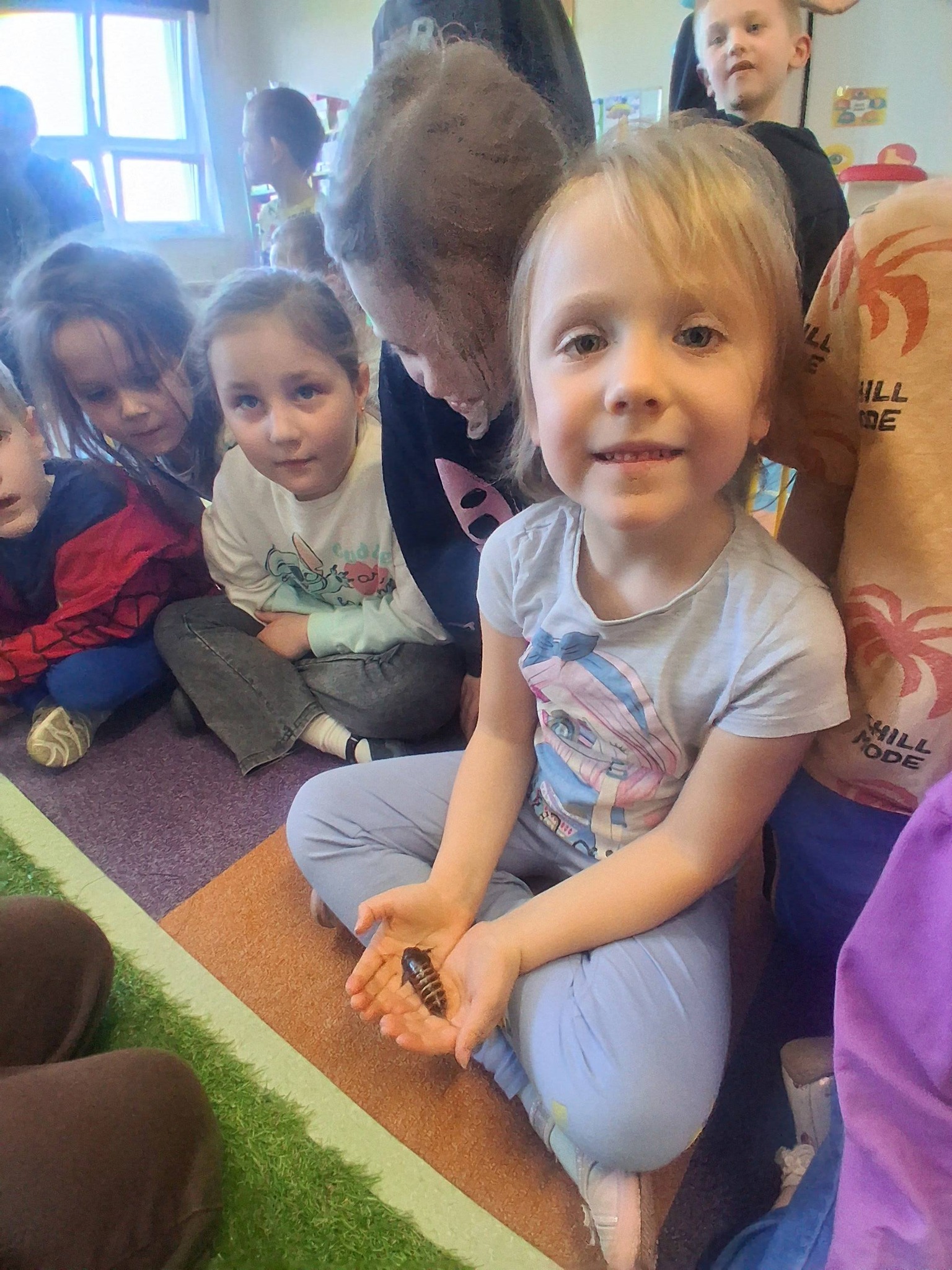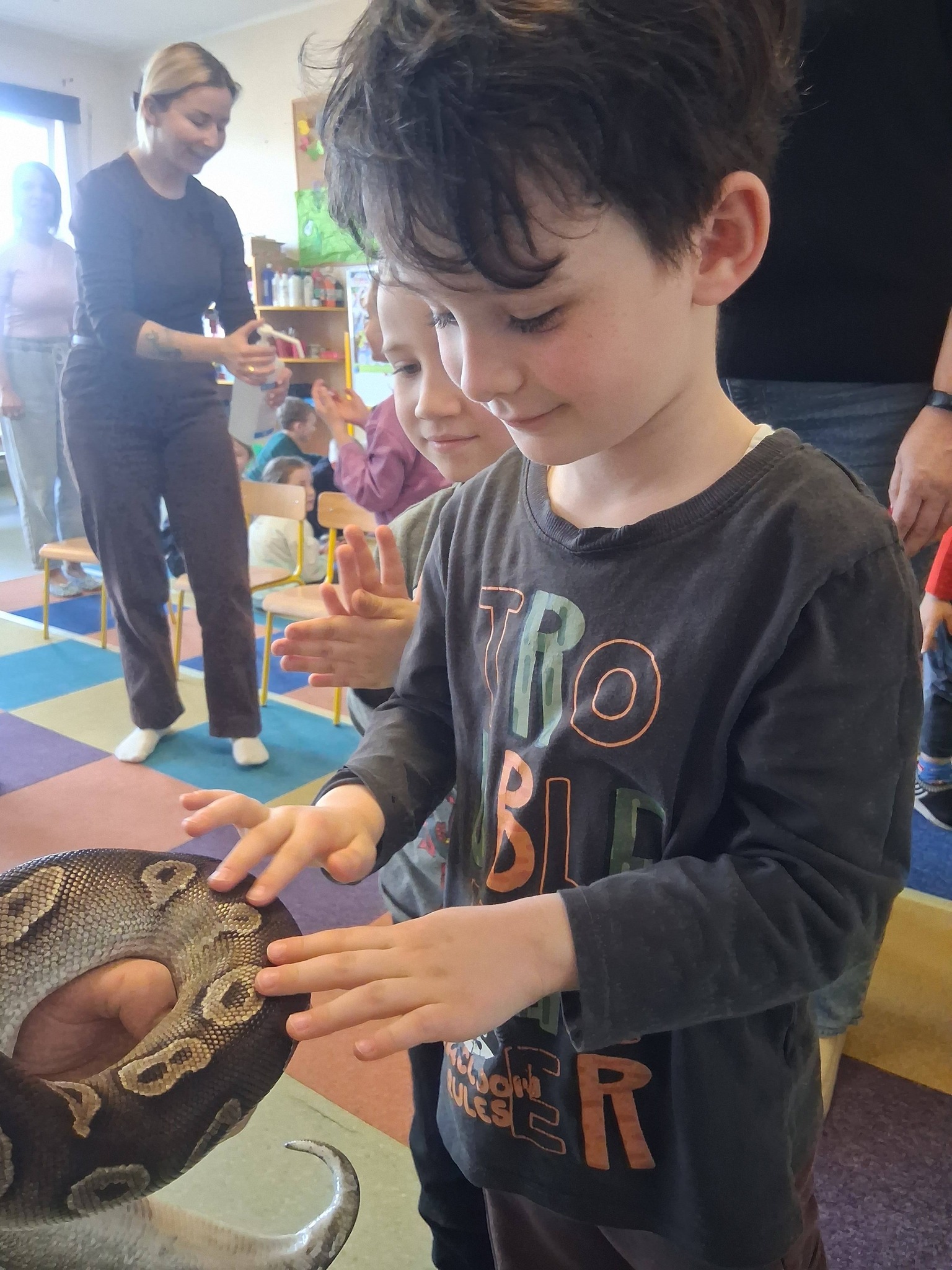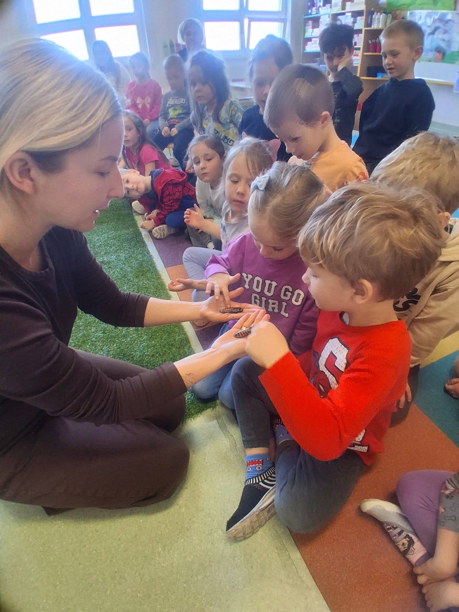 Nasze przedszkole odwiedziły niedawno egzotyczne zwierzęta, mieszkające na co dzień po sąsiedzku w Bytkowie. Opiekunowie przedstawili nam karaczana madagaskarskiego, agamę brodatą, żabę byk, żółwia greckiego, ślimaka olbrzyma oraz węża pytona. Dzieci z ogromnym zainteresowaniem przyjęły zwierzaki, miały sporo pytań, a najodważniejsi próbowali się zaprzyjaźnić ze zwierzętami bliżej. Okazało się, że w Świecie Zwierząt mieszka aż 200 ciekawych zwierzaków. Takie spotkania bardzo rozbudzają zainteresowania i wyobraźnię dzieci. Dziękujemy za odwiedziny.